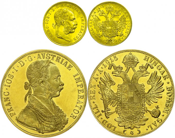 Two of the most frequent gold coins of Europe, which are represented in almost every gold coin collection, are the 1 and 4 ducat coins of Austria. The 1 and 4 ducat coins with the date 1915 are continuously restruck/re-stamped by the state. The small 1ducat coin has a fine weight of about 3.44g. The large equivalent to 4 ducats weighs 13.76g of fine gold. Both coins are traded close to the gold price.