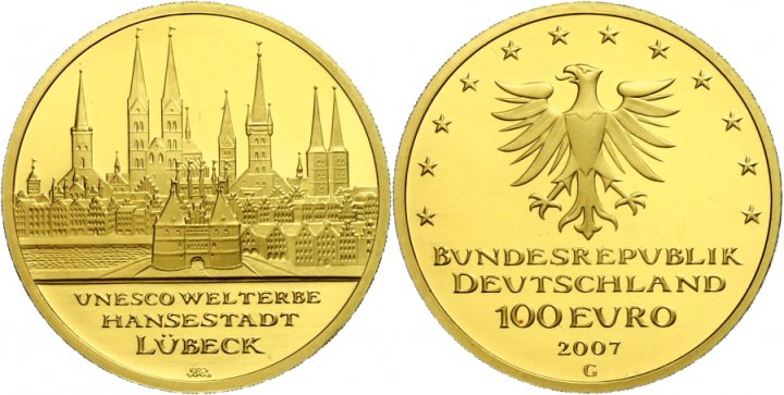 Since 2002, 100 euro gold coins with changing portraits were minted (½ ounce, 15.55g) annually. The commemorative coins minted in five mints (A, D, F, G and J) are delivered with a certificate and a black box. As the number of the popular 100 euro coins is very high (40,000-100,000 coins per mint), their price is more or less close to the gold price.