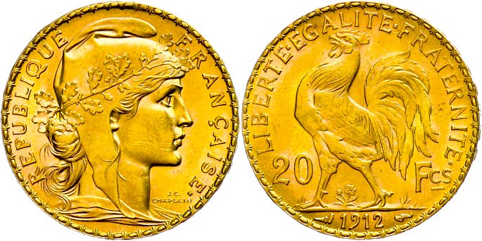 The 20 franc gold coin of which millions were minted between 1906 and 1914 is a frequent gold coin, just like the 1 and 4 ducat coins of Austria. Especially coins from 1907 onwards are frequent. This coin is easy to recognize by its beautiful portrait – the Gallic rooster on the reverse. The fine weight is 5.80g and has almost no collector's value. Like so many gold coins from this time, this coin is also traded close to the gold price.