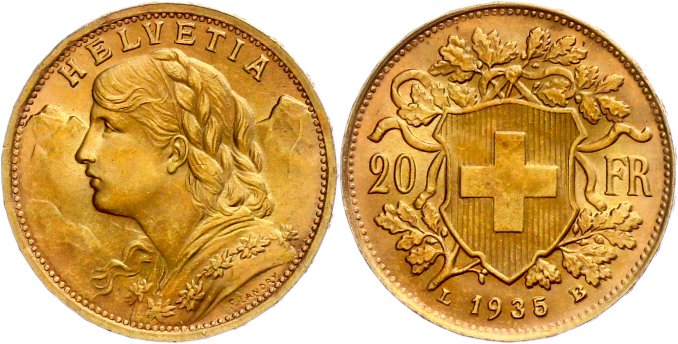With 5.80g of fine gold and a high number of several million coins, the Swiss Vreneli is among the most frequent gold coins in Europe. The 20 franc coins minted in Bern between 1886 and 1949 are also found in the 10 and 100 franc denominations. The latter is very rare and is traded at international auctions for high four-digit and even five-digit prices. The regular 20 franc coin can already be purchased at the daily gold price.